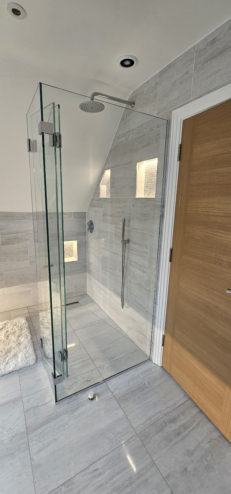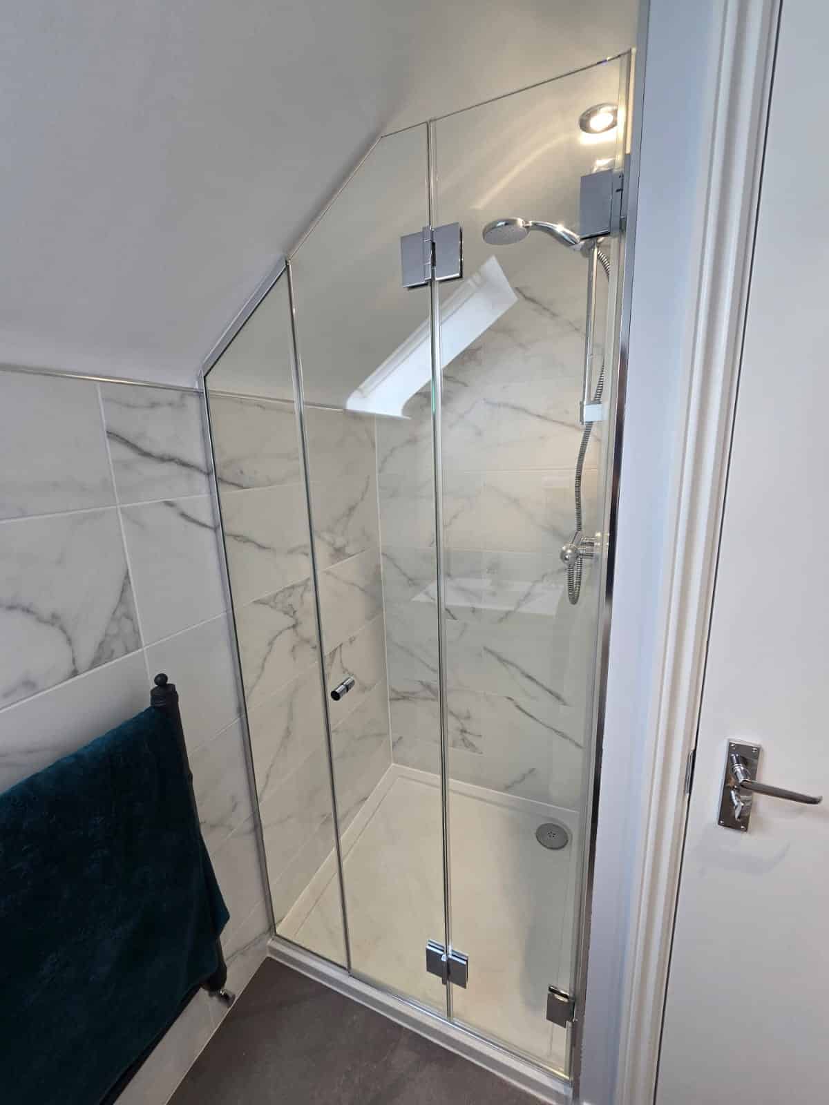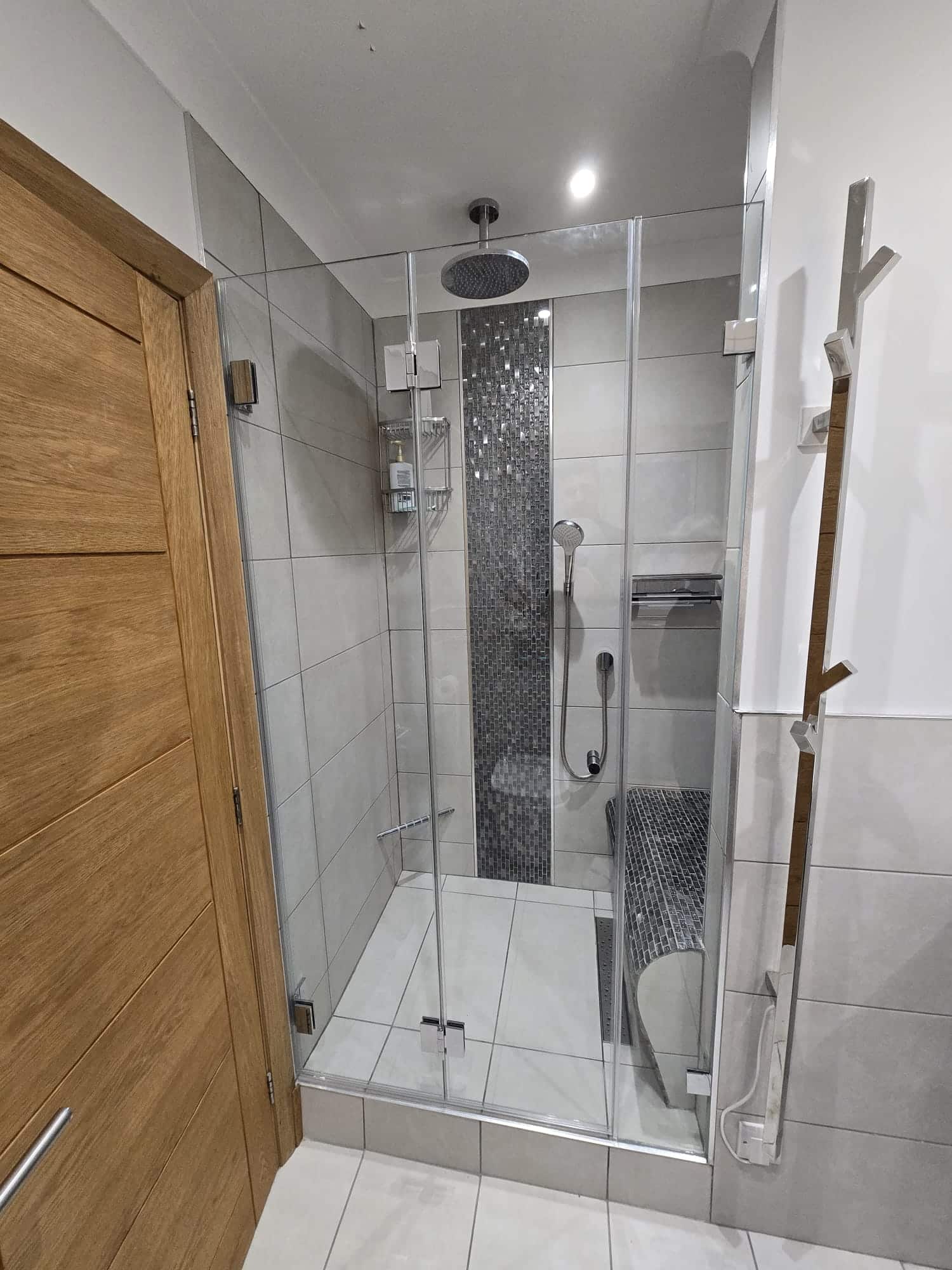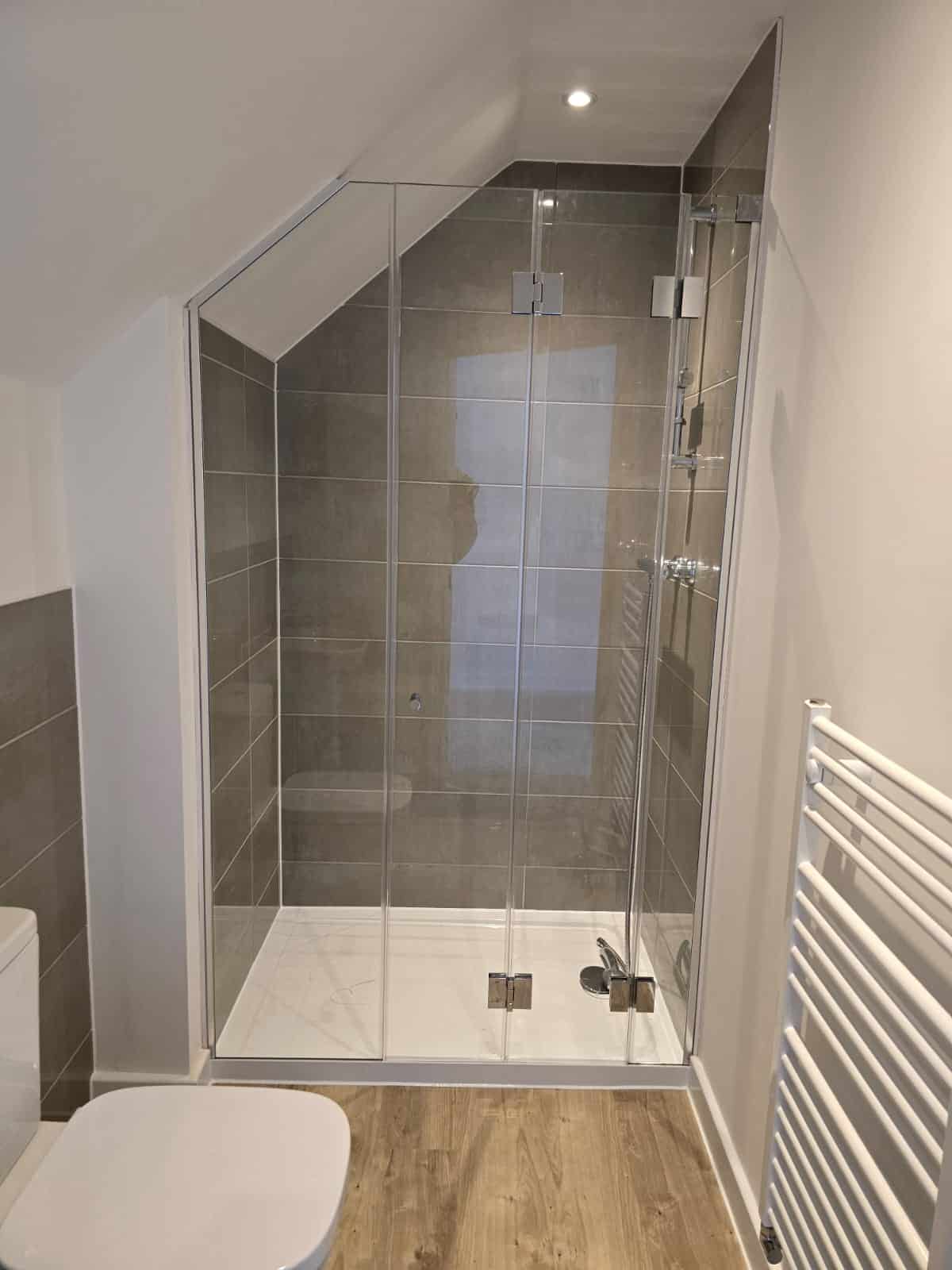 Explore our bifold shower gallery, showcasing custom glass installations designed for bathrooms where space and access are key considerations. Each bifold shower is made to measure, combining smooth folding operation with precise fitting and a clean, practical finish.